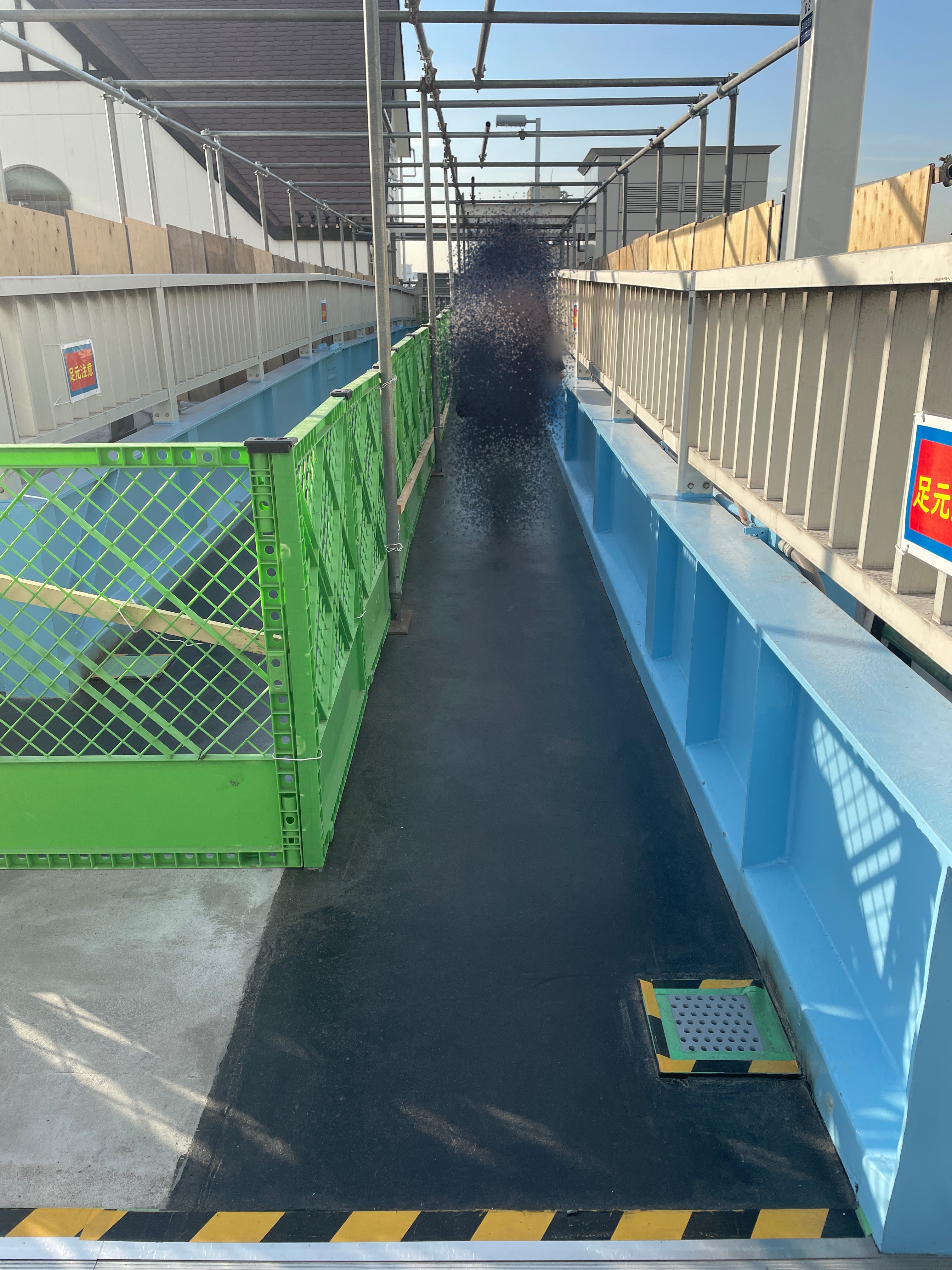 現在、行政による補修工事が行われており、しばらくの間、工事用の柵により道幅が狭くなっておりましたが、
